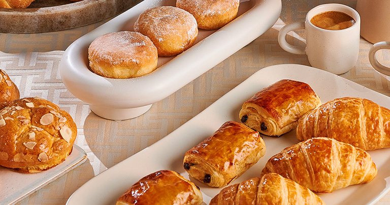 Στον πρωινό μπουφέ, ξεχωρίζουν τα τραγανά τυροπιτάκια, τα λαχταριστά croissants, τα αφράτα ψωμάκια και τα απολαυστικά beignets, μπάρες δημητριακών, brownies και cake όλα φτιαγμένα με τα πιο αγνά υλικά και τη συνέπεια ποιότητας που χαρακτηρίζει τη ΡΟΔΟΥΛΑ.